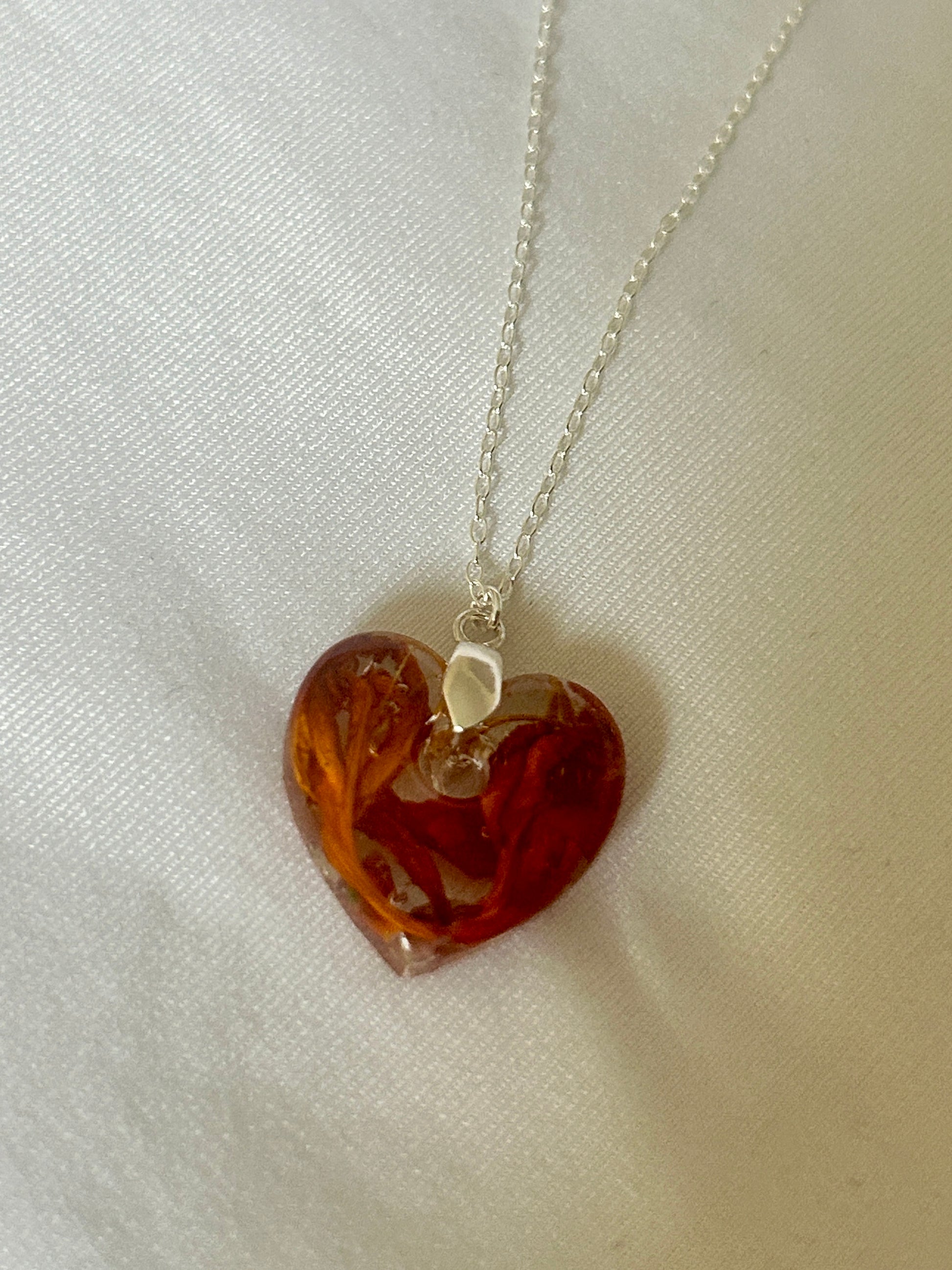 Real dried Crocosmia flowers in a heart pendant necklace.