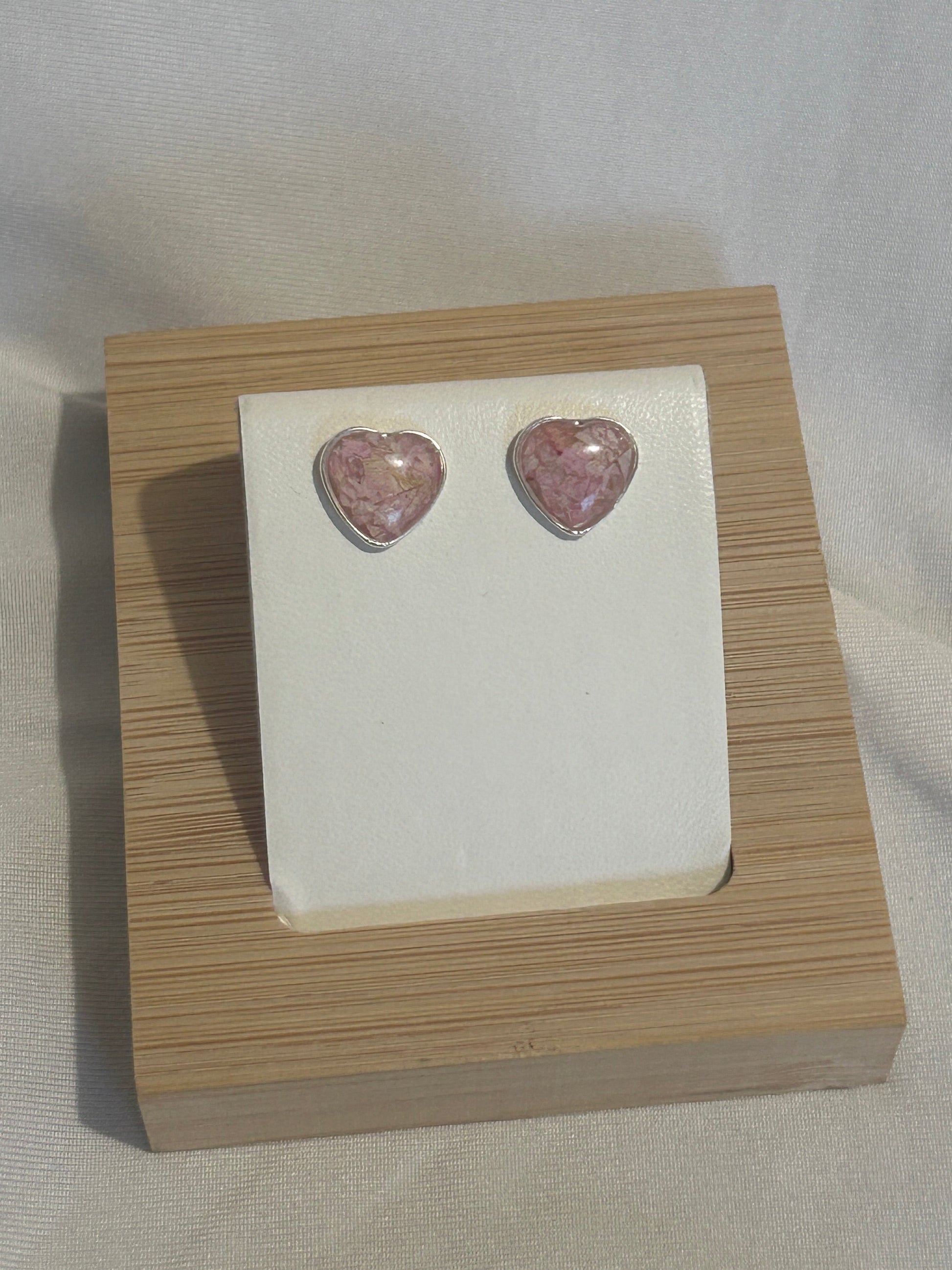 Real dried crushed Larkspur petals heart stud earrings.